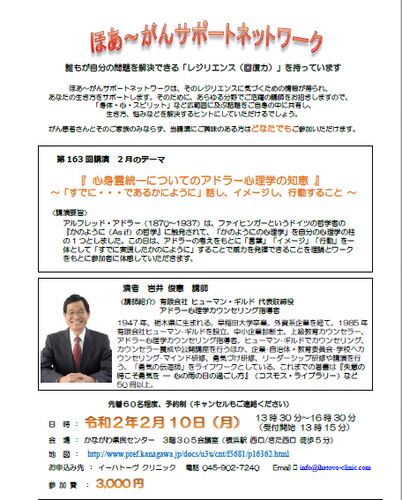 おはようございます。アドラー心理学に基づく勇気づけの研修(外部研修も)とカウンセリングを行う ヒューマン・ギルド の岩井俊憲です。 昨日(2月10日)の13:30~16:30は、横浜のかながわ県民センター 3階305会議室でイーハトーヴ クリニック (萩原優…