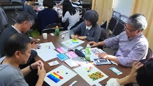 講座の後半は、岡田さんが準備されたアートのツールをもとに、赤・青・黄色の3色の絵具を使ってのフィンガー・ペインティング。