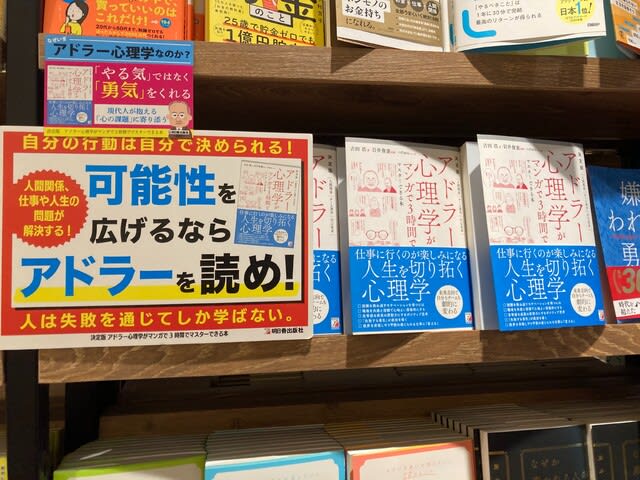 帰路にはブックファーストで本を買ったついでに店内を見まわしたら、一昨日のブログで「『決定版 アドラー心理学がマンガで3時間でマスターできる本』がまたもや重版:トータル1万6,000部」としてお伝えした監修本の『決定版 アドラー心理学がマンガで3時間でマスターできる本』のPOP広告が目立ちました。