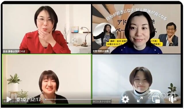 私を除く3人のタッグは抜群で、この講座の告知や私の本のプロモーション、さらには次回の第7期オンライン開催アドラー心理学ベーシック・コース(土曜6日間コース)へのバトンパスまで至れり尽くせりのご尽力をいただいています。