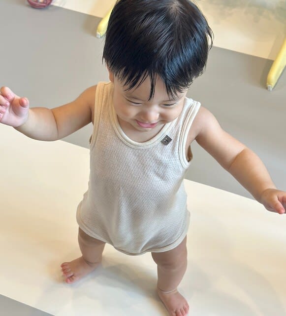 7月7日の誕生10カ月には、遊具から手を放して立つ姿が確認でき、両家のジサマ、バサマが喜んでいたら、昨日は、しっかりと立っている姿が確認できました。
