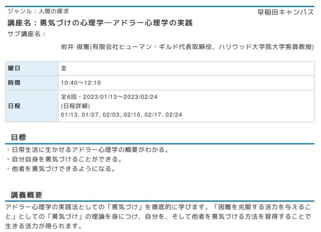 1.早稲田大学エクステンションセンターで『勇気づけの心理学』の講座開講決定